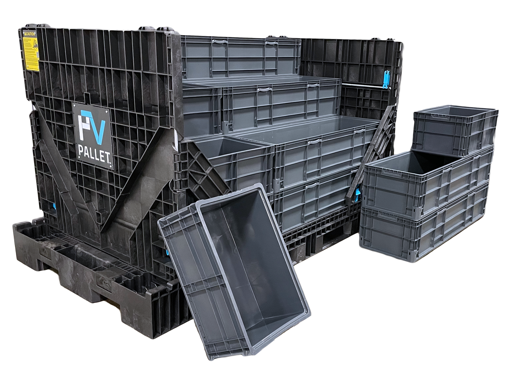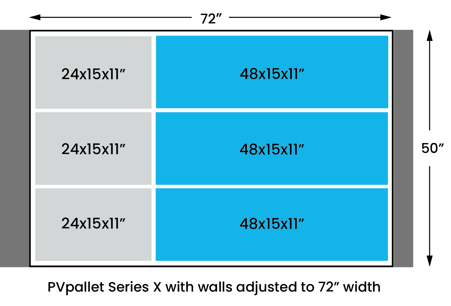 PVpallet Series X can be fully cubed using a combination of two tote sizes: 24 x 15 x 11” and 48 x 15 x 11”, stacked four high. Mix and match these sizes with solar modules to create a custom kitting, inventory, or shipping solution.